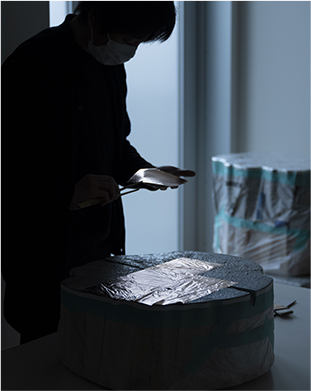 箔は、その薄さにより対象となる素材の質感を包み込み、人が感知できないほどの微かな光さえ逃さず捉え、