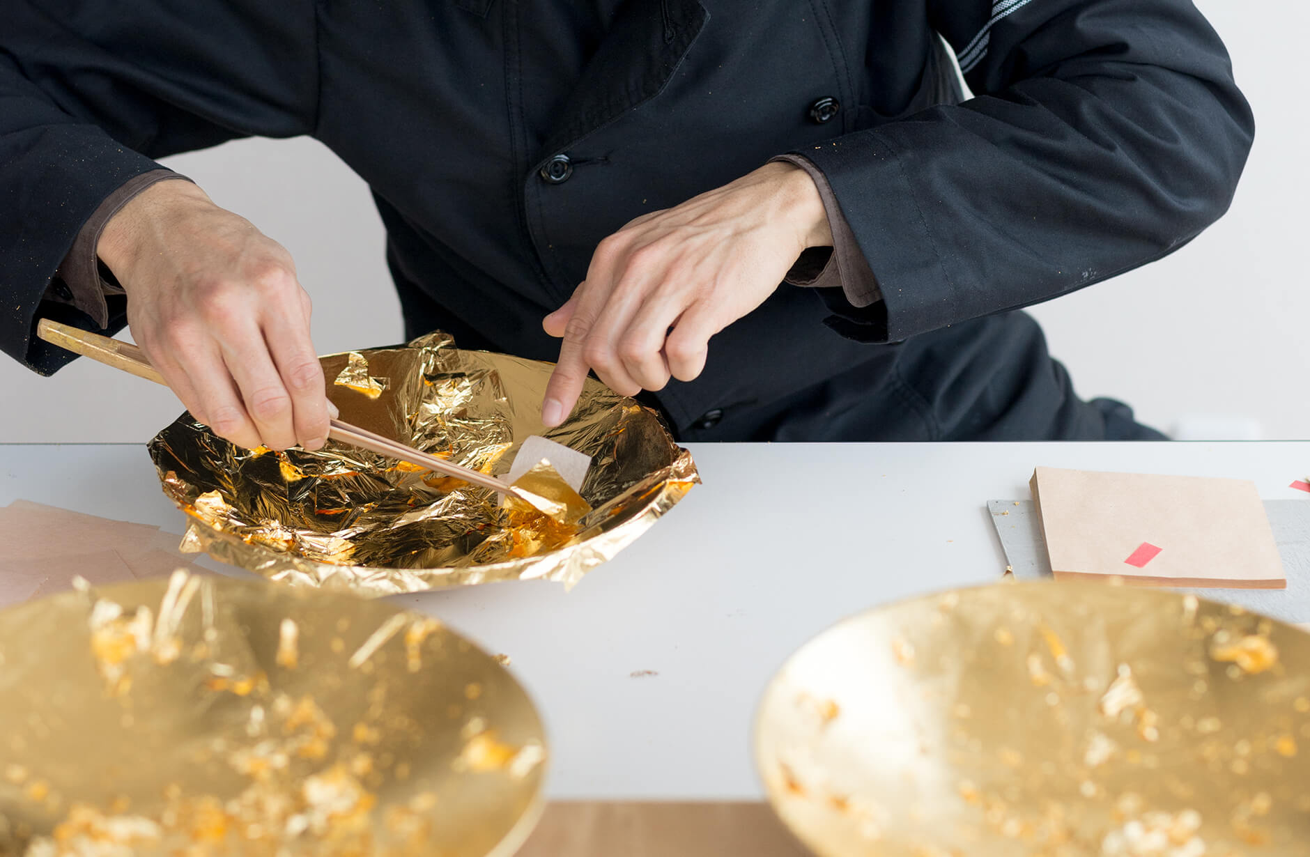 「箔品工房」は、器・インテリア・アクセサリーなどさまざまなカテゴリーの「箔品」をひとつひとつていねいな手仕事でつくっています。基材の下処理を施し、接着剤を塗布し、箔を置く。そして、箔の上からコーティングを施す。箔の置き方からコーティングに至るまで、アイテムごとに“箔本来の力と美しさを追求し、最大限に活かしきる”ために箔座が行うことはそれだけではありません。