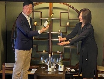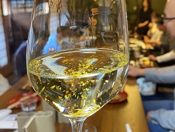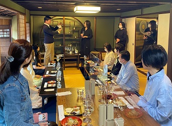 新作の金箔入りワイン「能登の風 2022」の発売にあたり、株式会社ハイディワイナリー代表 高作正樹氏をお招きし、ワインにまつわるお話や能登の風と二種のテイスティングをお楽しみいただきました。おつまみは、ワインにぴったりのチーズやたこ焼きもご用意。金沢ひがし茶屋街の情緒に浸りながら、ゆったりとしたひとときとなりました。