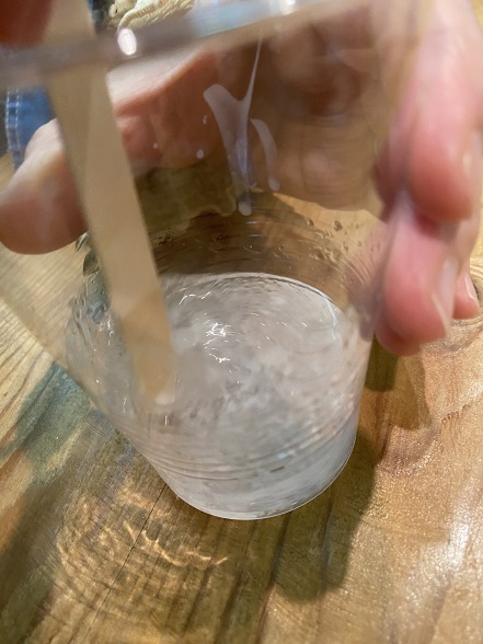 ひたすら混ぜていくと…透明だった成分が徐々に白いクリーム状に変化しました。「不思議~!」と、お子様も大人も皆さん真剣です!