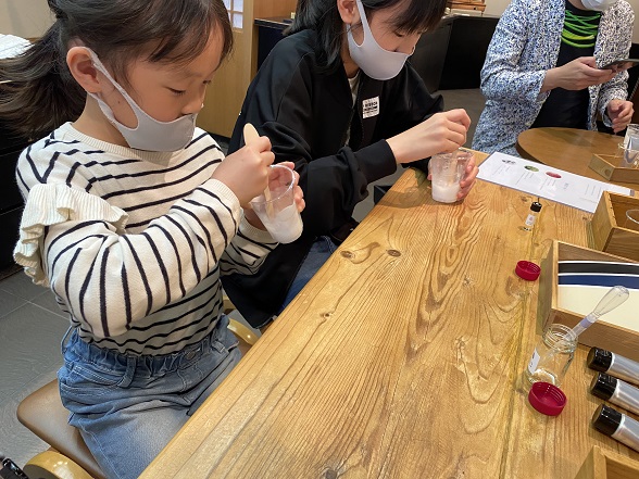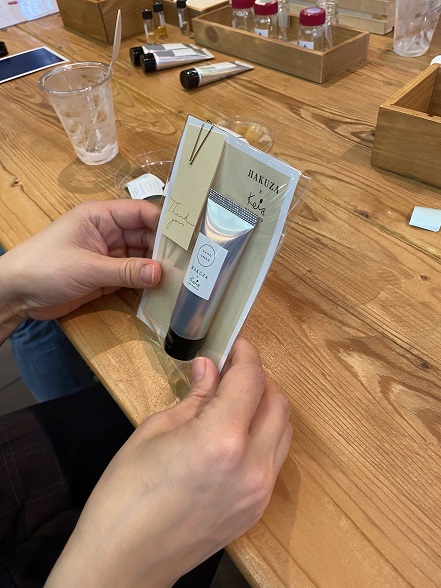 チューブにラベルを貼って、ラッピング用の台紙も選んでいただいたら完成!マイハンドクリームに皆さん「楽しかった!」と笑顔。早速使っていただき、自身で選んだ香りとみずみずしい使用感にも満足いただけたようでした。ぜひ毎日お使いください!