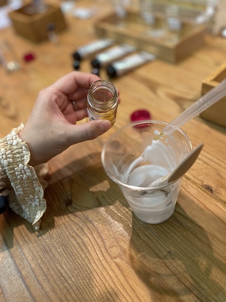 続いて香りを3種類から1つ選び、混ぜ合わせたハンドクリームに2~3適ほど入れます。今回の香りはエレガントフローラル、ウッドフォレスト、ハーバルブレンド。皆さんじっくり悩み、一番好きな香りをセレクト。1滴ずつ濃さを調整できるのも手作りならではです。