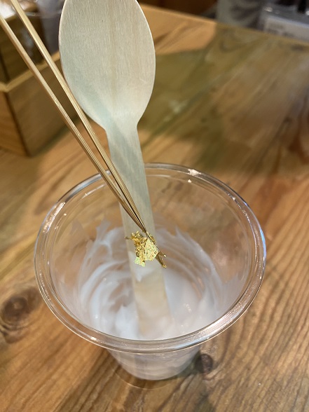 そして仕上げに金箔をイン!大きな箔の欠片(切廻し)をハンドクリームと一緒に混ぜると徐々に細かくなっていきます。細かくなり過ぎないように、しっかり確認しながら混ぜたら出来上がり。ケイズのお二人にバトンタッチして、チューブに入れていただきます。
