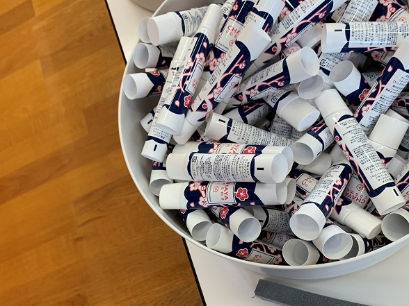 箔座では、新商品の登場、ブランドラインの変更や販売終了といった理由により、製品化前の資材が在庫として倉庫に大量に残っていました。ポンプタイプのボトルや、コンパクトケース、製品に付随するブラシやフィルム、紙箱など。本来であれば、費用をかけて廃棄となります。