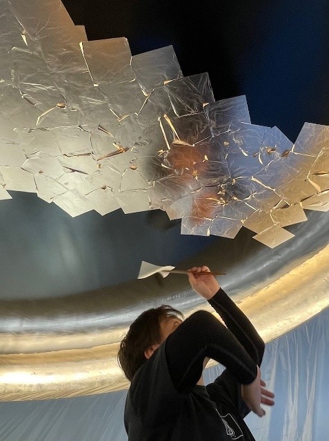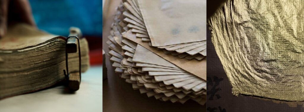 箔は、その薄さにより対象となる素材の質感を包み込み、人が感知できないほどの微かな光さえ逃さず捉え、影をも味方につけながら、自らの光として輝きます。