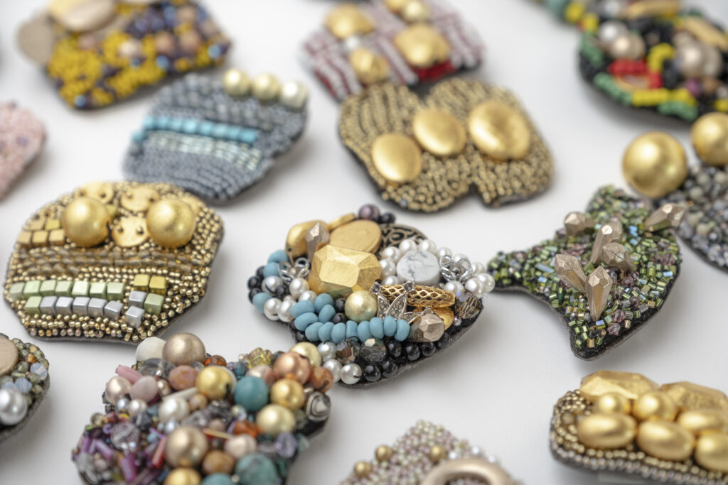 箔座の箔押職人が金箔を施したパーツを、irodoriの作り手が自由な感性と豊かな色彩感覚で、個性あふれるブローチに仕立てました。
