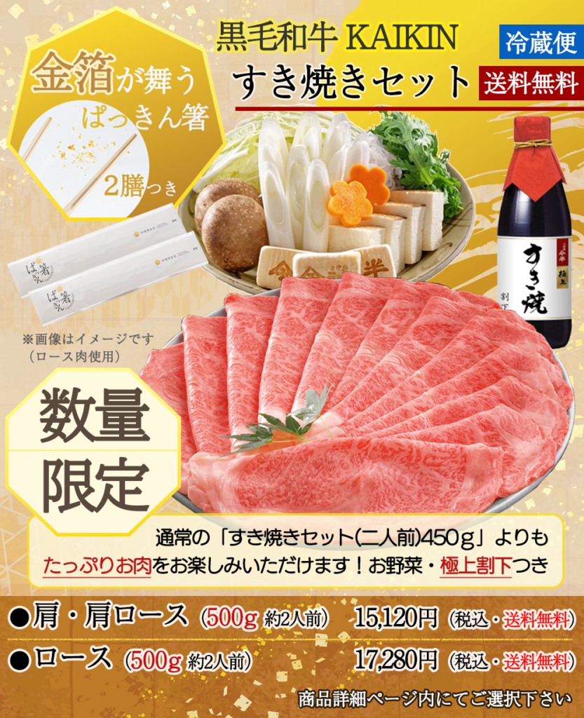 黒毛和牛KAIKINすき焼きセット(肩・肩ロース500g)約二人前野菜・極上割下付き 送料無料15,120円(税込) 黒毛和牛KAIKINすき焼きセット(ロース500g)約二人前野菜・極上割下付き 送料無料17,280円(税込) 商品ページURL https://store.imahan.com/shopdetail/000000000562