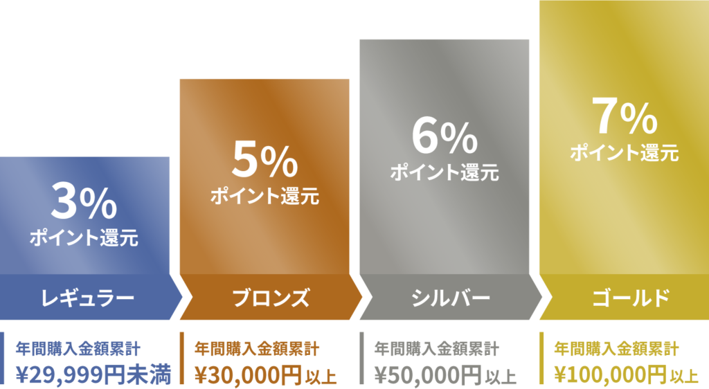 会員ステージに応じたポイント還元率アップで、最大7%ポイント還元いたします。