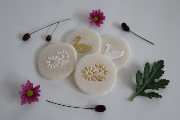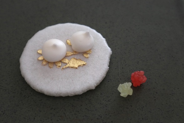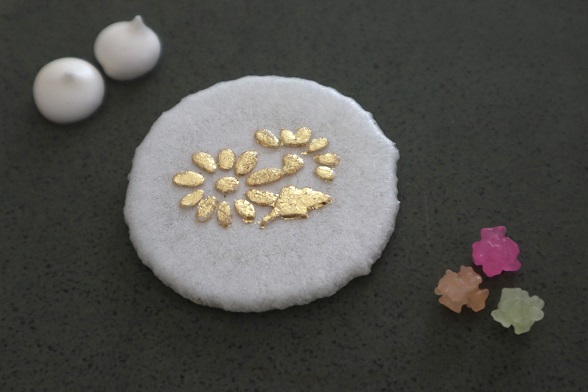 今回のお菓子は、重陽の節句の風習をお菓子で表現しています。メレンゲを真綿に見立て、金の菊の上にのせてみてください。お皿の上で、小さな菊の被せ綿をお楽しみいただけます。