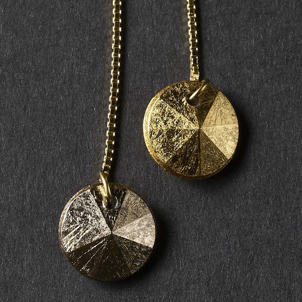 円盤型のアクリルディスクを、職人がひとつひとつ丁寧に箔でくるみました。光を受けると、放射状のカットに沿ってシャープな箔の陰影が生まれます。