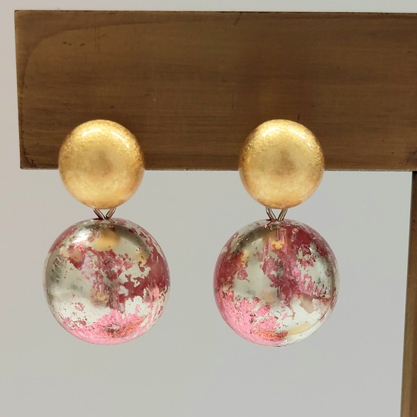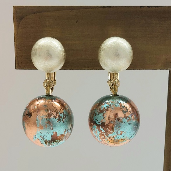 耳元に沿う一粒目は、箔を全面に施した10㎜の「箔珠」、軽やかに揺れる二粒目は、16㎜サイズの大粒の「色箔珠」です。