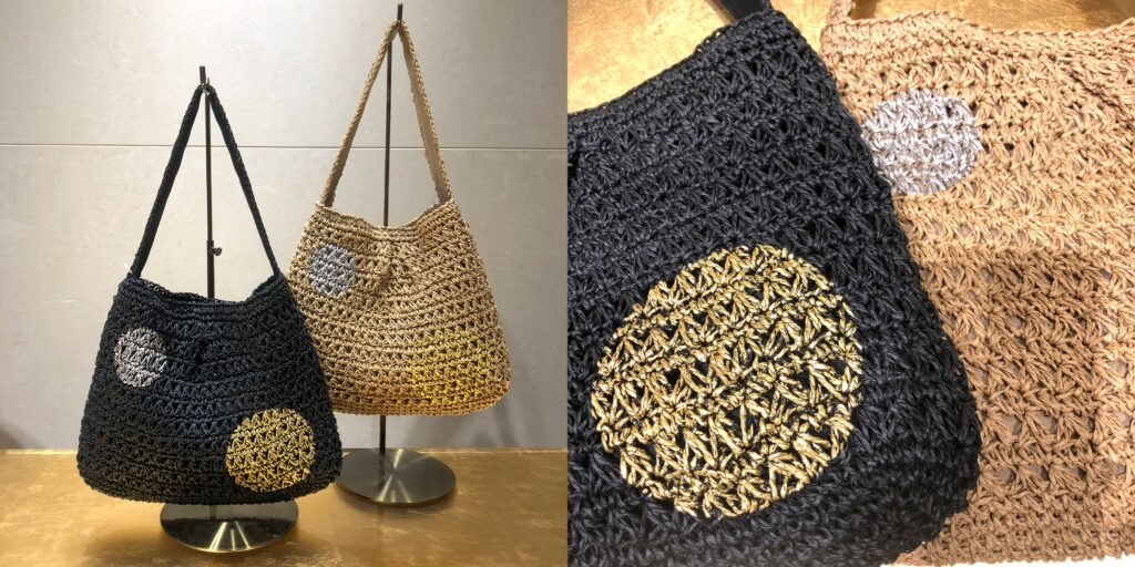 ナチュラルな透かし編が涼しげなバッグに、人気のドット柄を施しました。