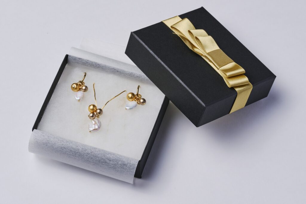 純金プラチナ箔「永遠色」、「久遠色」の2色の金箔を纏った「箔珠(はくだま)」と、淡水パールが調和するホリデーシーズンにふさわしいアクセサリーをご用意しました。ネックレス&ピアス(もしくはイヤリング)のセットのほかに、単品でブレスレットもございます。ゴールドリボンをあしらった、ギフトに最適な専用ボックス入り。