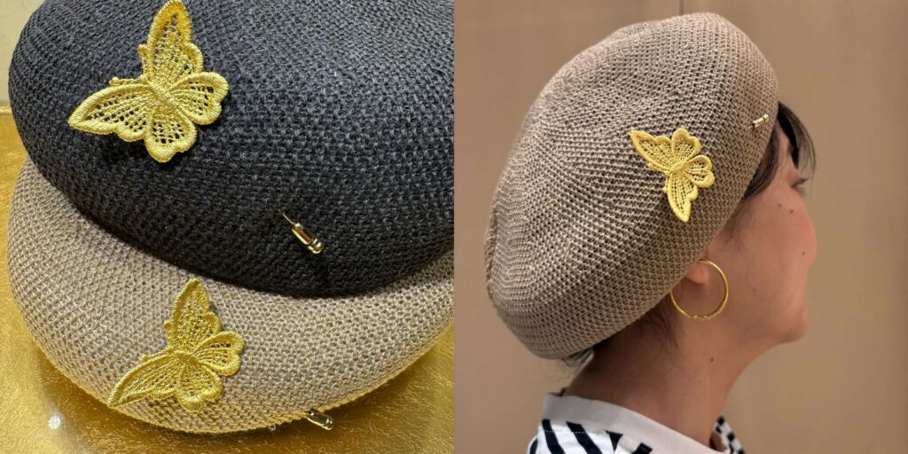 輝く蝶がベレーの上で羽を休めているような遊び心ある組合わせです。
