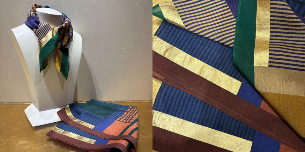 薄手のコットンシルクスカーフに箔のレクタングルを配しました。